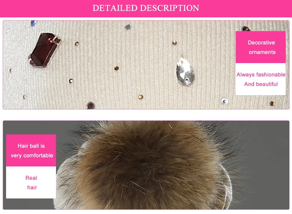 - כובע נשים שרוג עם פום פום פרווה דביבון אמיתי, הקובע הקלאסי מקושט באבני יהלומים – צמר + אקריליק