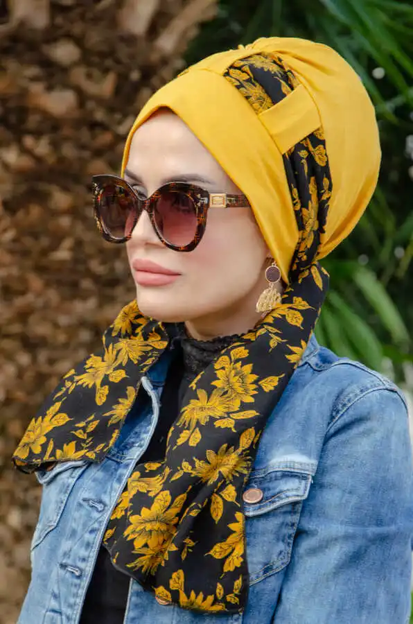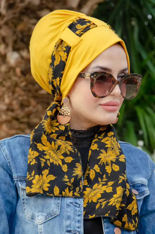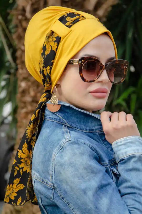 כיסוי ראש טורבן לבובו גבוה בצבע צהוב שחור פרחוני עם סרט קשירה ולולאות, עיצוב חדש ומודרני